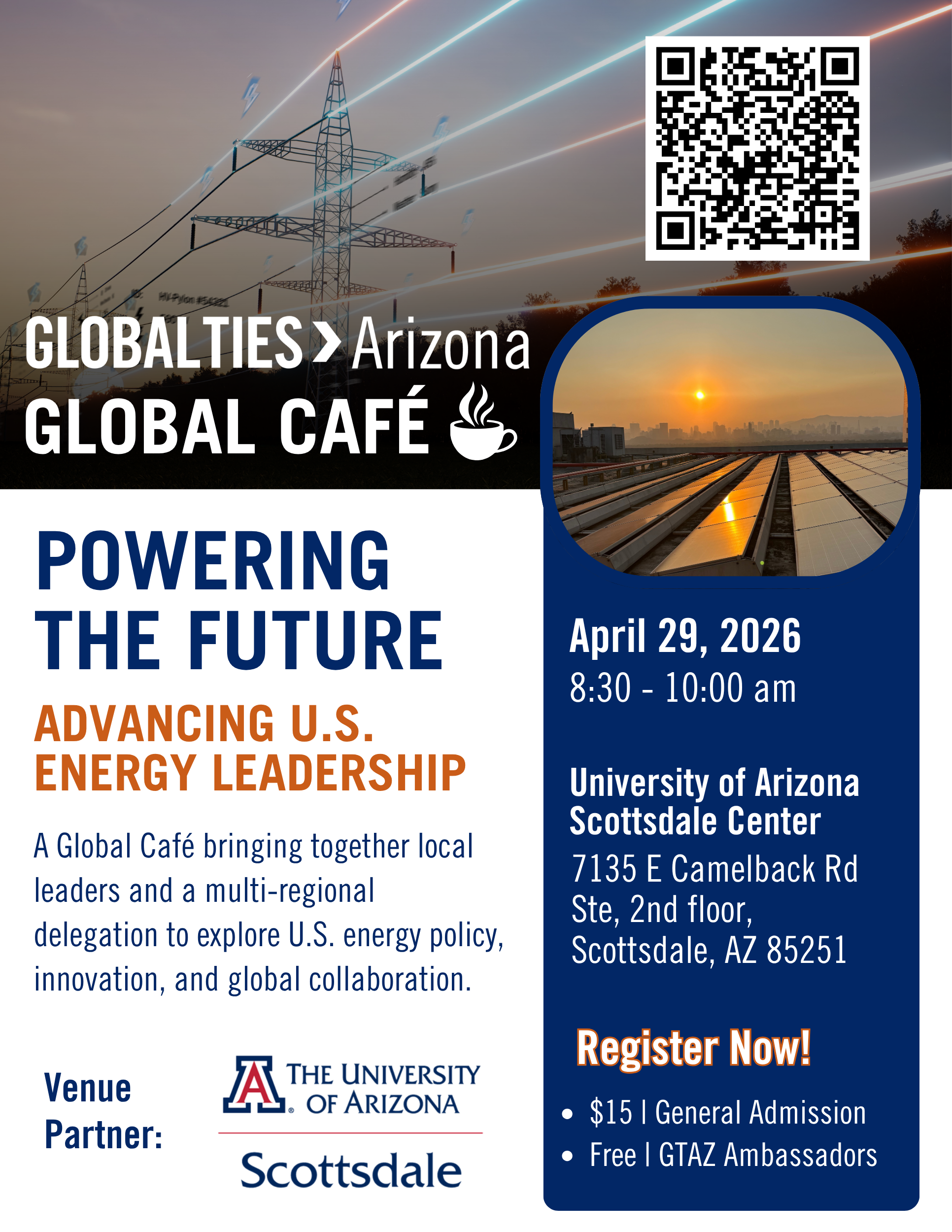 This Global Café convenes a multi-regional delegation and Arizona-based leaders to explore key priorities shaping U.S. energy leadership. The event will highlight Arizona’s innovation, infrastructure, and international cooperation, offering participants the opportunity to share insights and build connections across sectors.